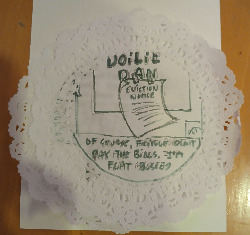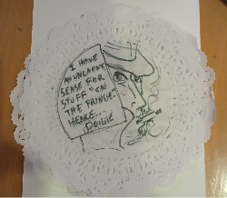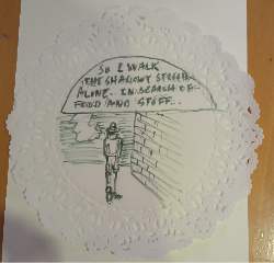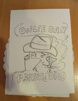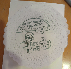 The comic/zine I busted out was titled "Doilie Dan, Private Dick." There were a bunch of doilies available in the art supplies for Valentine's themed projects, so I decided to go with those as my pages/panels. After six pages describing my erstwhile detective and his lack of casework, I stapled them together between two pieces of cardstock and dropped the finished product in the trade box. (Someone got a one-a-kinder!)